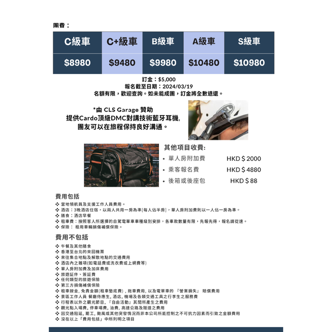 租車費:按照客人所選擇的自駕電單車車種級別安排,各車款數量有限 ,先報先得 ,報名請從速
