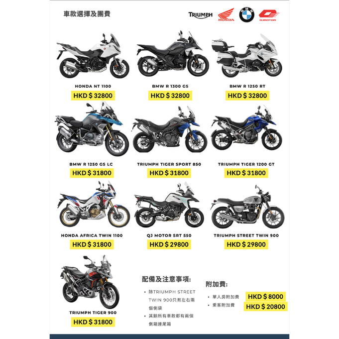 租⾞費:按照客⼈所選擇的⾃駕電單⾞⾞種級別安排,各⾞款數量有限,先報先得,報名請從速
